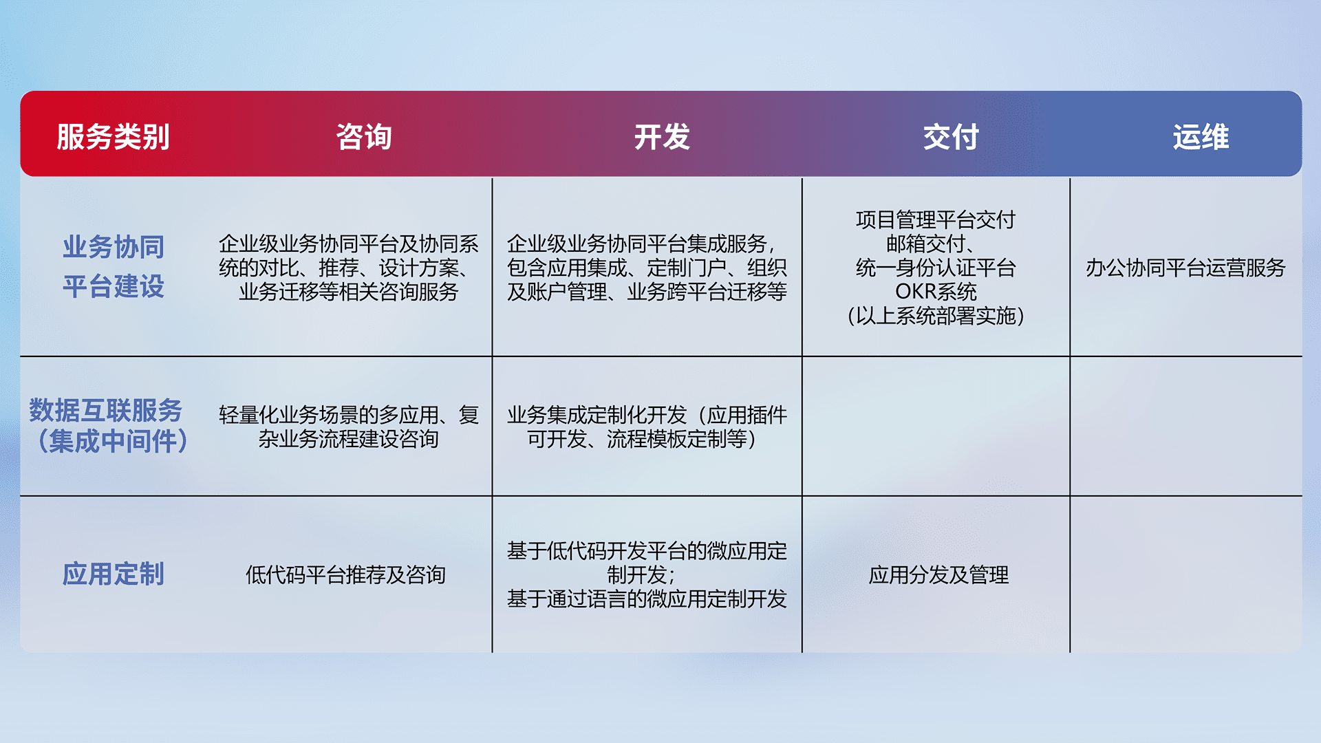 针对钉钉、、、、企微、、、IDaas等平台级产品提供产品的规划、、方案、、、交付、、、定制化开发等服务,,,实现如统一协同办公、、智能客户服务、、混合会议管理、、、智能数据查询、、、等业务场景,,实现数字化转型。。。。
